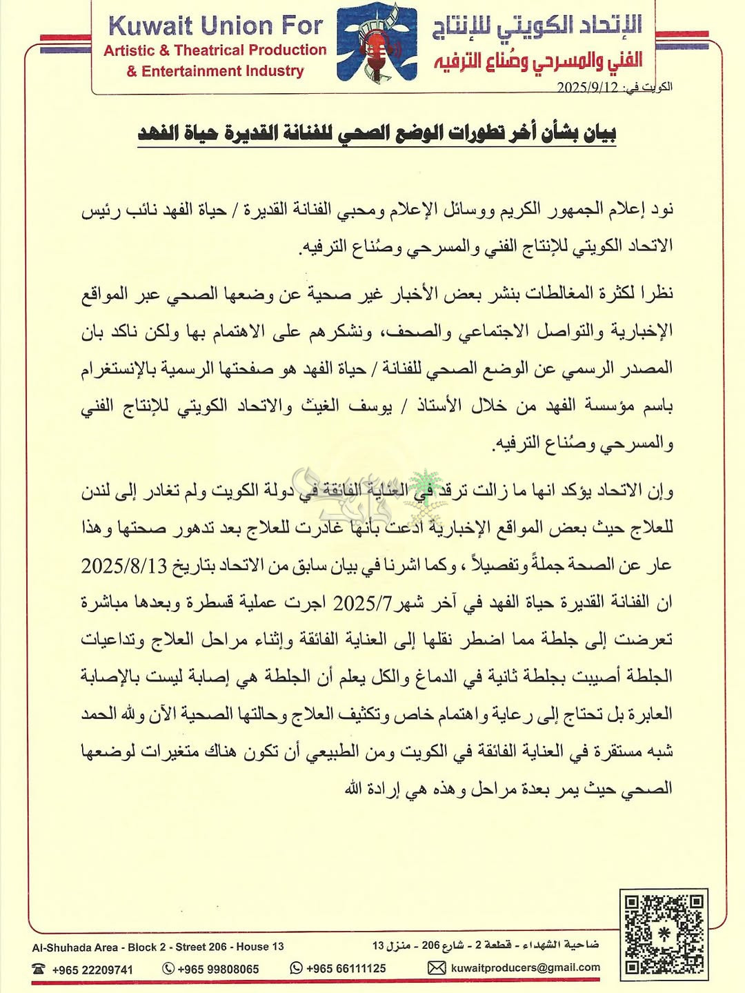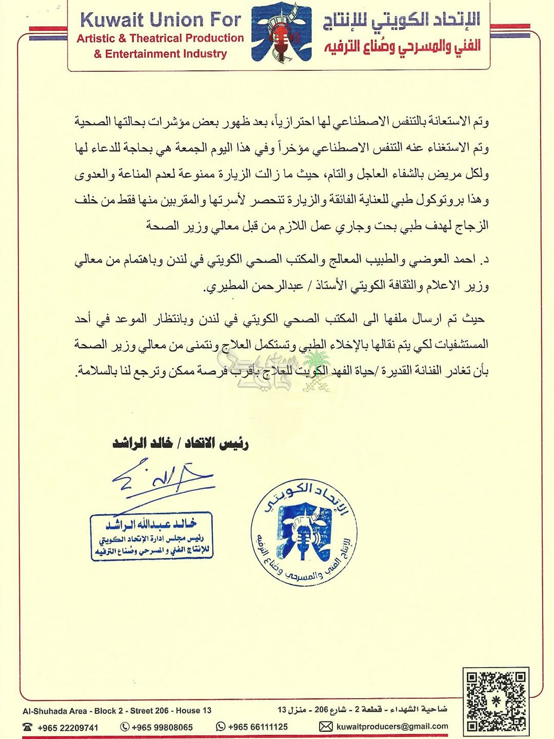 أصدر الاتحاد الكويتي للإنتاج الفني والمسرحي وصنّاع الترفيه بيانًا رسميًا أكد فيه عدم صحة ما تردد بشأن سفر الفنانة إلى لندن لاستكمال علاجها، موضحًا أنها ما زالت تخضع للرعاية الطبية داخل الكويت، وبالتحديد في قسم العناية المركزة.