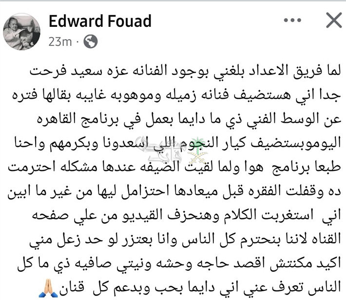 اعتذار إدوارد الرسمي عن حلقة الفنانة عزة سعيد