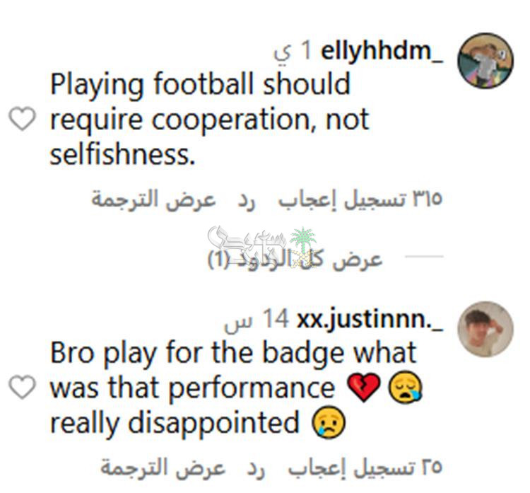 • وجاء في أحد التعليقات: “لعب كرة القدم يتطلب التعاون وليس الأنانية”.
