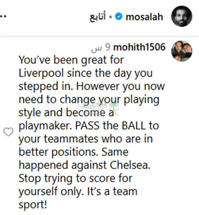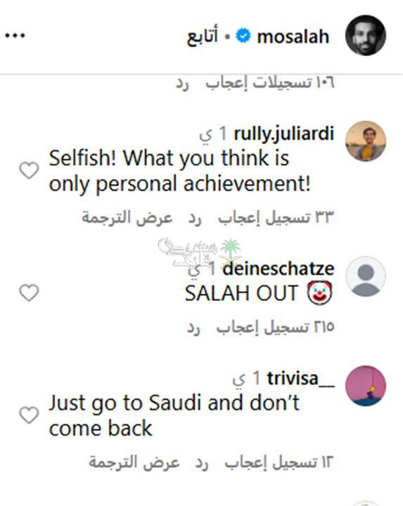 وشهد حساب محمد صلاح على إنستغرام سيلًا من التعليقات الغاضبة من جماهير الريدز، التي عبّرت عن استيائها من تراجع مستواه، حيث طالب البعض برحيله عن الفريق، بينما انتقد آخرون أسلوب لعبه الفردي وعدم تمريره الكرة لزملائه.