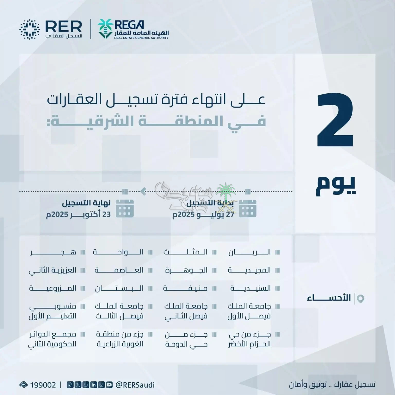 أعلنت الهيئة العامة للعقار عن اقتراب الموعد النهائي لانتهاء فترة تسجيل العقارات في الأحساء بالمنطقة الشرقية، والذي يشمل 14,878 قطعة عقارية موزعة على 20 حيًا.