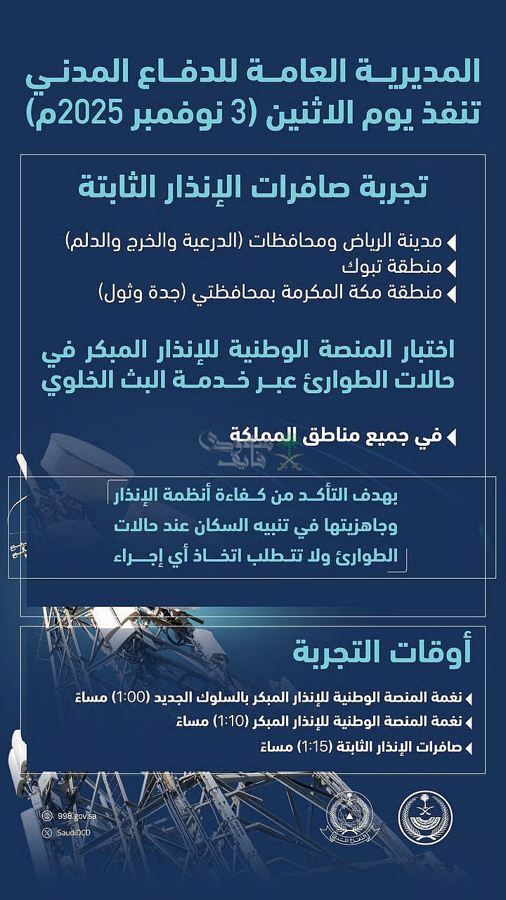 تُنفّذ المديرية العامة للدفاع المدني، اليوم الاثنين الموافق 3 نوفمبر 2025، تجربة ميدانية لصافرات الإنذار المبكر الثابتة في عدد من المناطق، وذلك في إطار خططها المستمرة لرفع مستوى الجاهزية وتعزيز كفاءة أنظمة التنبيه خلال حالات الطوارئ.