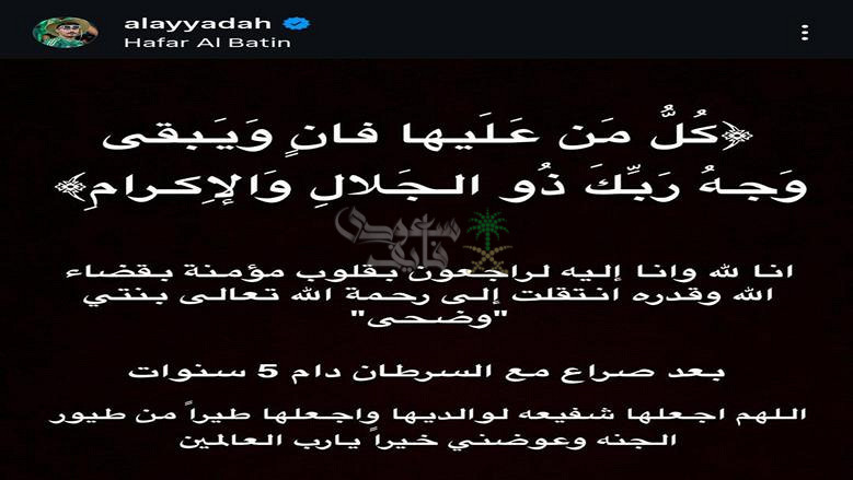 وأعلن عبدالله العيادة نبأ وفاة ابنته عبر حسابه الرسمي على “إنستغرام”، في منشور مؤثر عبّر فيه عن تسليمه الكامل لقضاء الله وقدره، قائلاً: “كل من عليها فان ويبقى وجه ربك ذو الجلال والإكرام.. إنا لله وإنا إليه راجعون. بقلوب مؤمنة بقضاء الله وقدره، انتقلت إلى رحمة الله تعالى بنتي وضحى بعد صراع مع السرطان دام 5 سنوات.. اللهم اجعلها شفيعة لوالديها، واجعلها طيرًا من طيور الجنة، وعوضني خيرًا يا رب العالمين.”