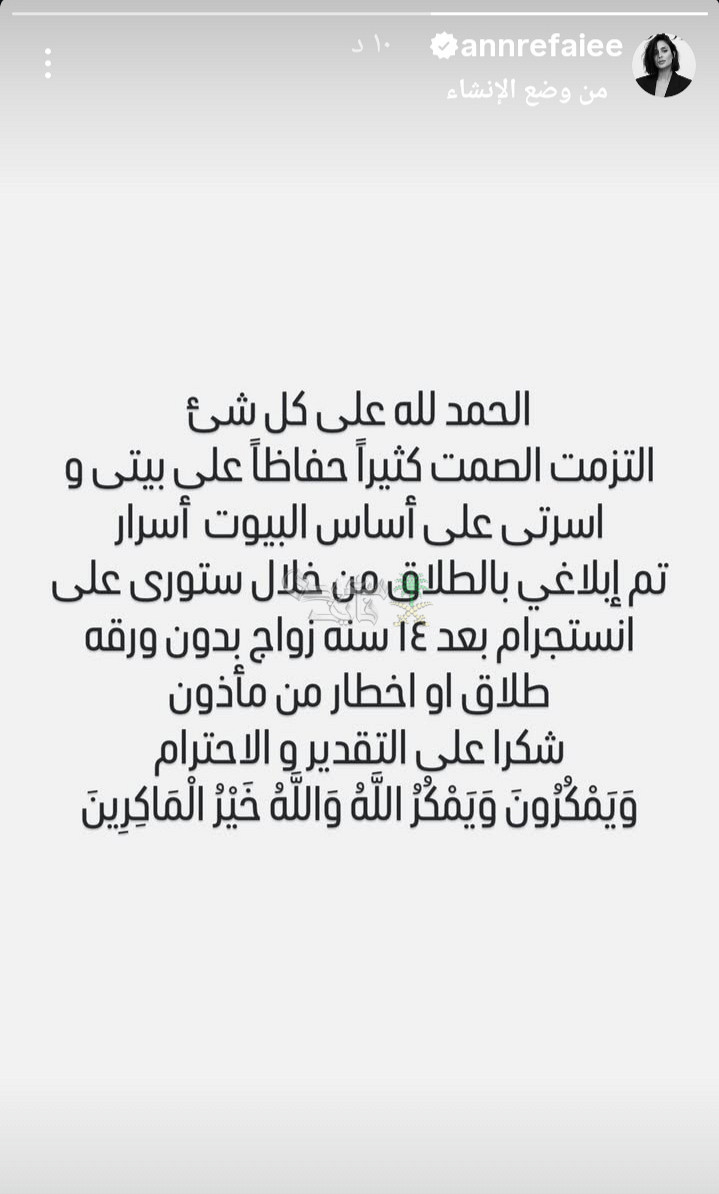 وقالت آن الرفاعي في منشور نشرته على انستقرام :”الحمد لله على كل شيء، التزمت الصمت كثيرًا حفاظًا على بيتي وأسرتي على أساس أن البيوت أسرار، لكن تم إبلاغي بالطلاق من خلال ستوري على إنستجرام بعد 14 سنة زواج، بدون ورقة طلاق أو إخطار من مأذون، شكرًا على التقدير والاحترام، وَيَمْكُرُونَ وَيَمْكُرُ اللَّهُ وَاللَّهُ خَيْرُ الْمَاكِرِينَ.”