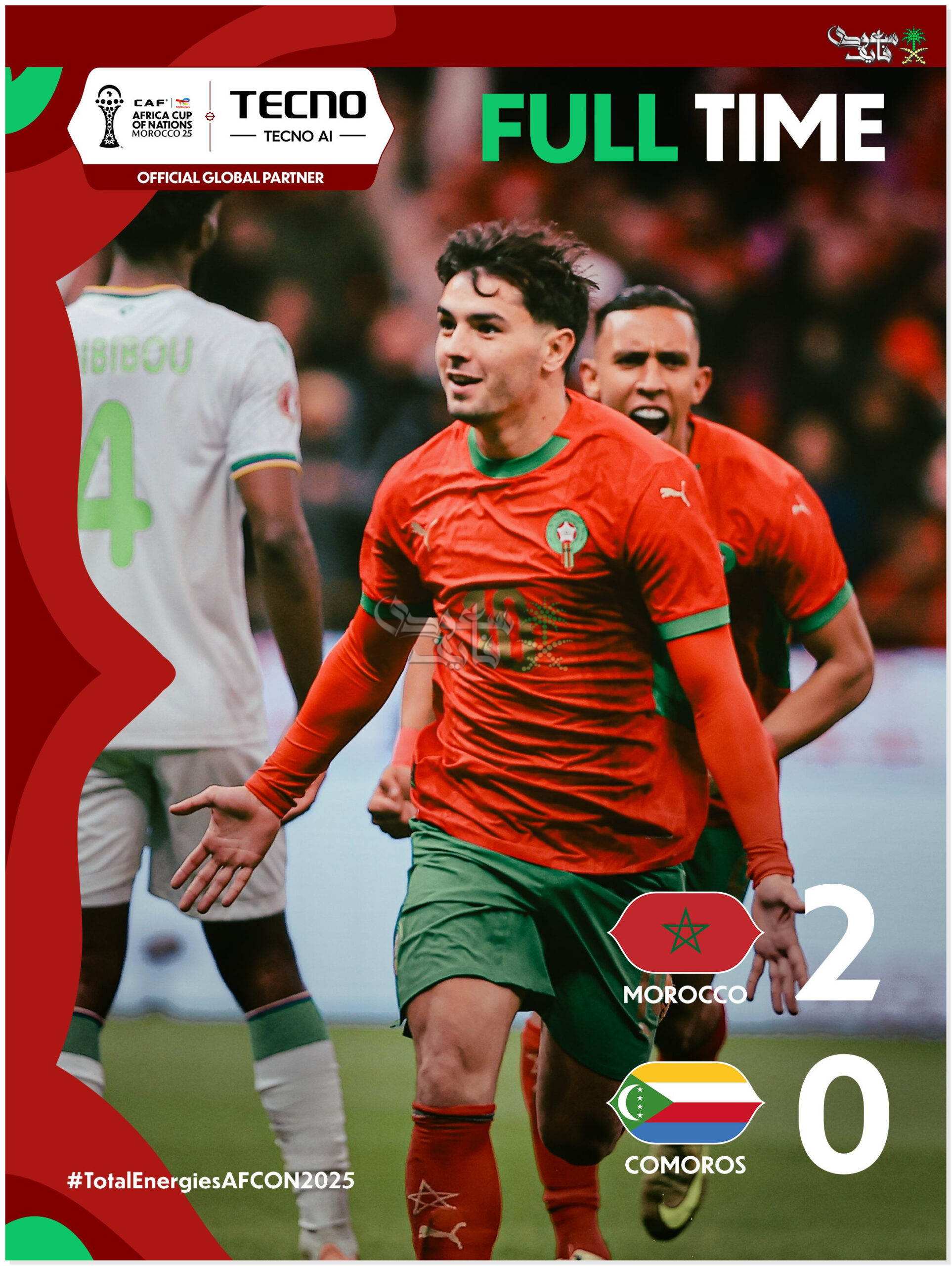 فيما يخص نتيجة مباراة المغرب ضد جزر القمر فقد نجح أسود الأطلس في حسم المواجهة لصالحهم بنتيجة هدفين دون رد، بعد أداء منظم وتركيز واضح طوال مجريات اللقاء.