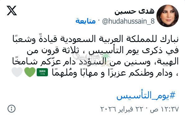 من جانبها، شاركت الفنانة هدى حسين رسالة تهنئة عبر منصة “إكس”، عبّرت فيها عن فخرها بالمملكة قيادةً وشعبًا، مؤكدة أن يوم التأسيس يمثل ثلاثة قرون من المجد والعزة، ومتمنية دوام الرفعة والاستقرار.