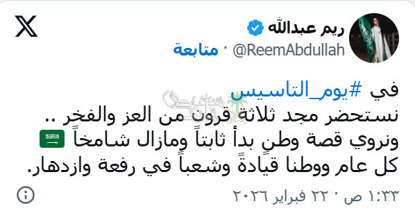 بدورها، عبّرت الفنانة نوال عبر “إكس” عن فخرها بجذور المملكة الراسخة، مشيرة إلى أن يوم التأسيس يمثل قصة وطن يمضي بثقة نحو المستقبل، وداعية بأن يديم الله الأمن على البلاد.